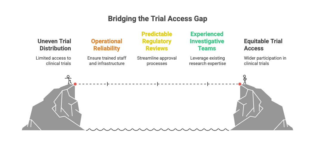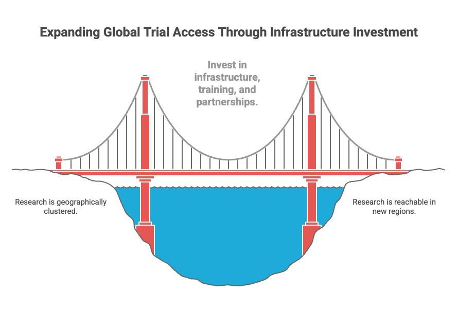 Broadening access is not as simple as adding more dots to a map. It requires long-term investment in research infrastructure, regulatory support, training, and local partnerships. It requires designing trials that can travel — operationally, culturally, and logistically — across different systems.