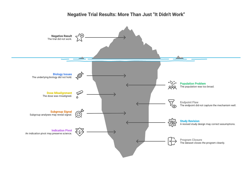 Subgroup analyses may reveal signal in a narrower population. A revised study design may correct earlier assumptions. An indication pivot may preserve part of the science.